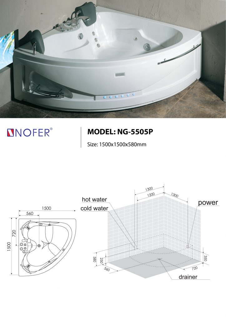 Bồn tắm massage NG-5505P là loại bồn tắm góc có hình dạng tam giác dành cho 2 người và được sở hữu kích thước là 1500 x 1500 x 580mm. Bồn tắm massage này có đầy đủ các thiết bị phục vụ cho việc tắm massage thư giãn như: gối tựa cổ làm từ cao su cao cấp và chất lượng, vòi sen cầm tay ,hệ thống tạo 2 dòng nước nóng lạnh, bộ lọc nước, mắt massage, mắt tạo bọt khí, bộ điều chỉnh tốc độ họng sục, bơm và van vòi nước.