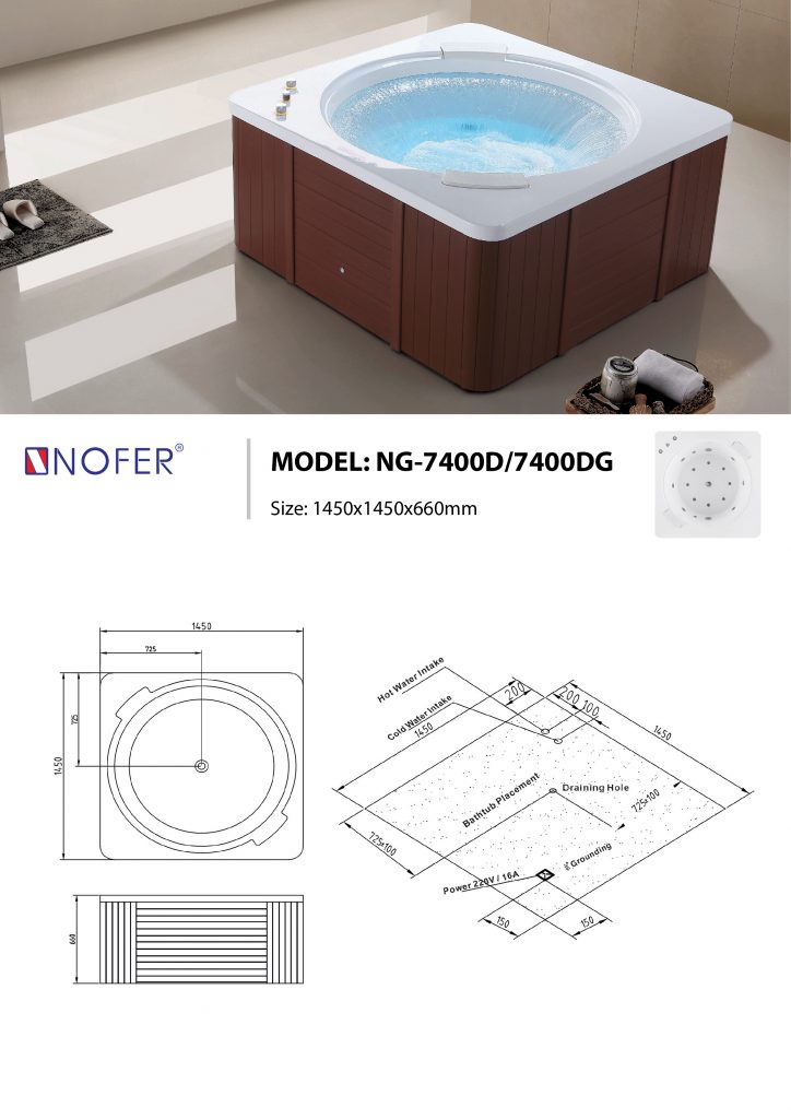 Bồn tắm massage NG-7400D/DG được thiết kế theo hình vuông với kích thước chiều dài x rộng x cao lần lượt là 1450 x 1450 x 660 (mm).