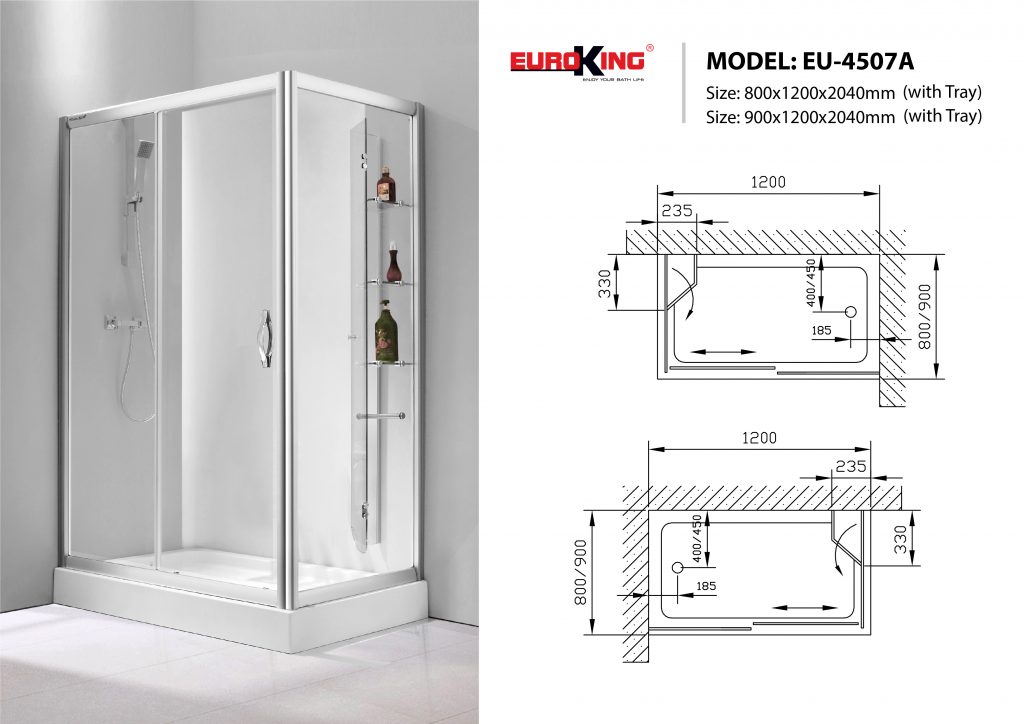 Bồn tắm đứng Euroking EU 4507A với thiết kế vuông vắn, tinh tế.tích hợp với không gian xung quanh. Bố trí nội thất bên trong tiện dụng với các khay kệ.