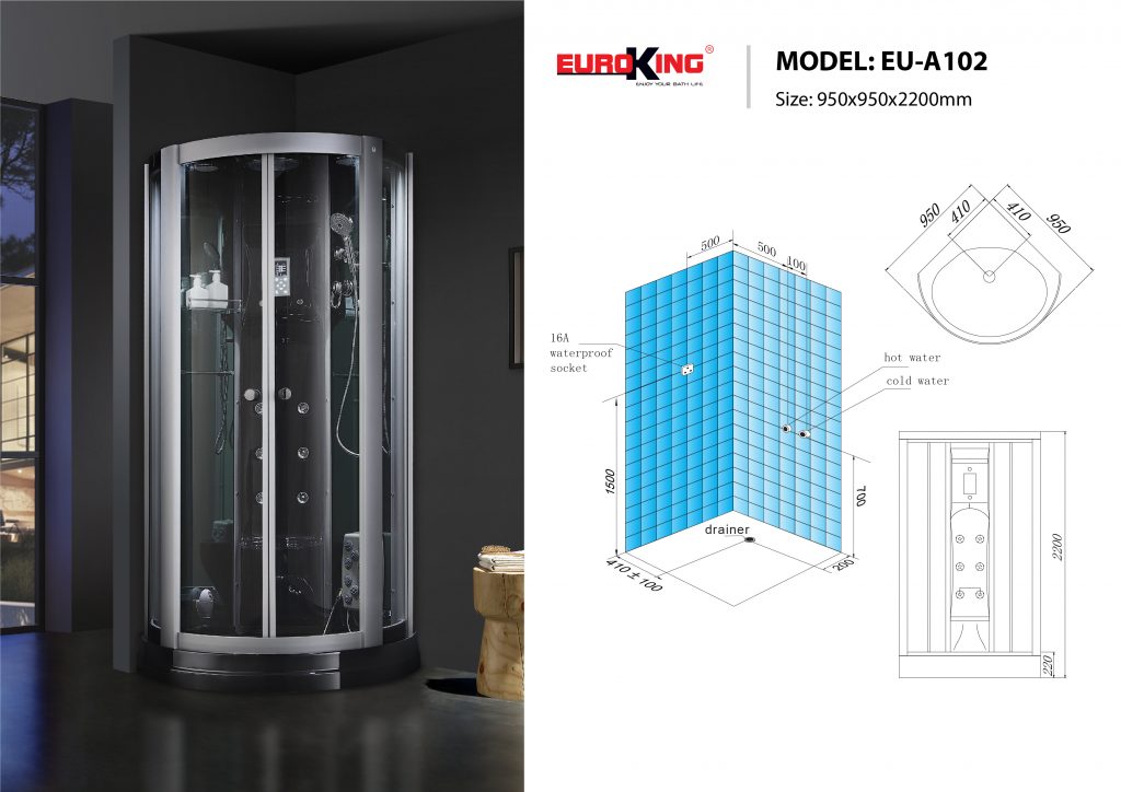 EU – A102 là dạng phòng xông hơi ướt thừa hưởng được tất cả những được tính mà một chiếc phòng xông nên có, đôi khi còn nhỉnh hơn một chút. Vẻ ngoài mạnh mẽ với tông màu đen xám, cùng thiết kế dạng góc nhỏ gọn sẽ không chiếm quá nhiều không gian trong phòng tắm nhà bạn. Kích thước chỉ khoảng 950*950*2200 mm rất phù hợp với những gian tắm nhỏ.