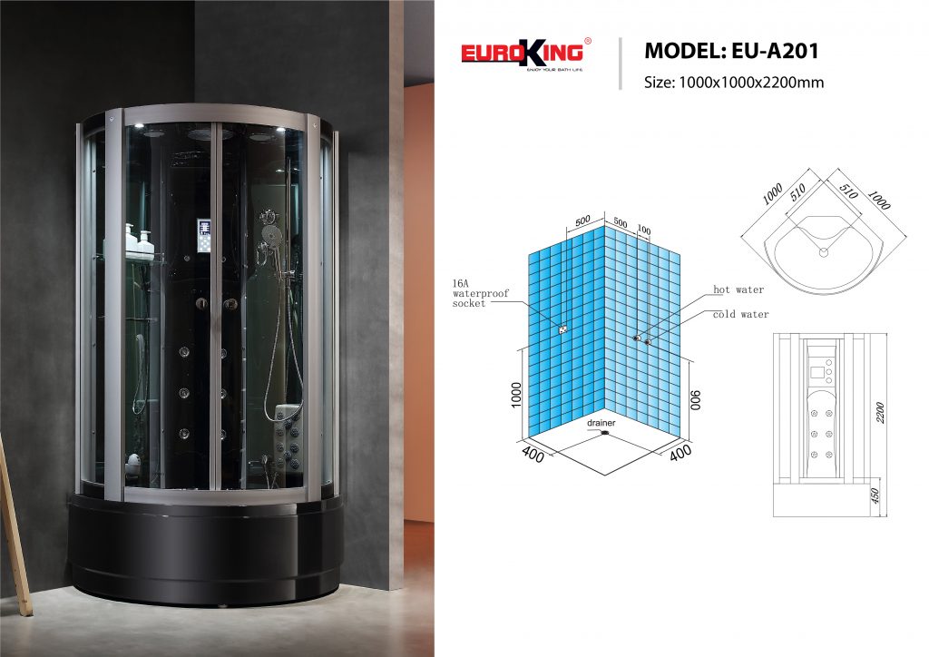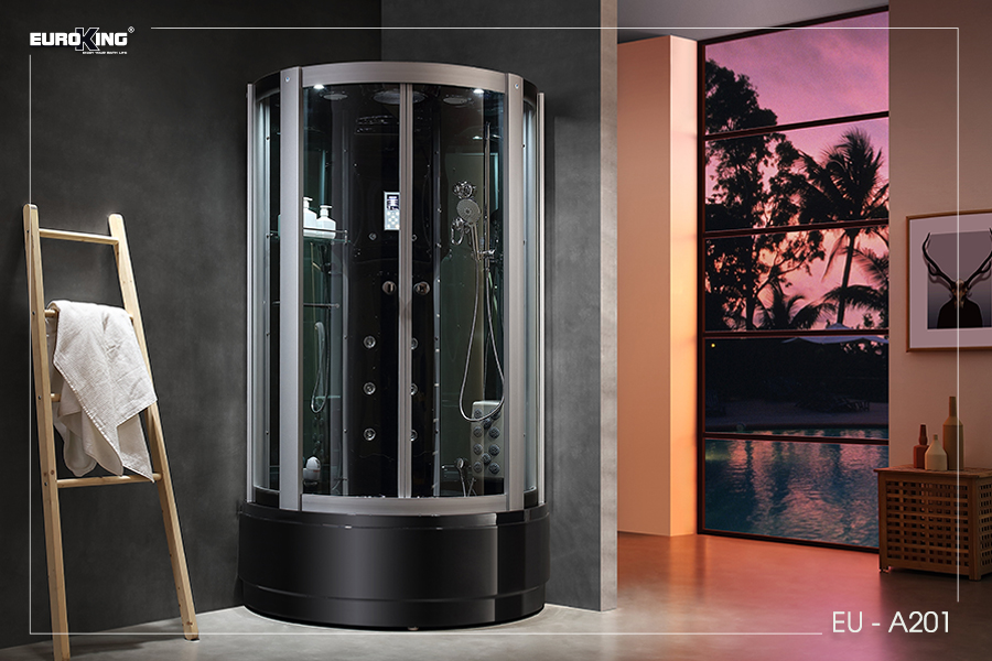 Phần khung EU – A201 bằng hợp kim nhôm chắc chắn, bên ngoài được mạ lớp chrome sáng bóng, sang trọng, có khả năng chống gỉ, chịu được trọng lượng lớn của phòng. Sản phẩm EU – A201 được tạo bằng những tấm kính cường lực có độ dày cao, chịu được sức nóng của phòng, chống va đập và an toàn cho người sử dụng.