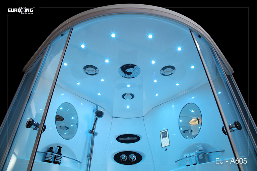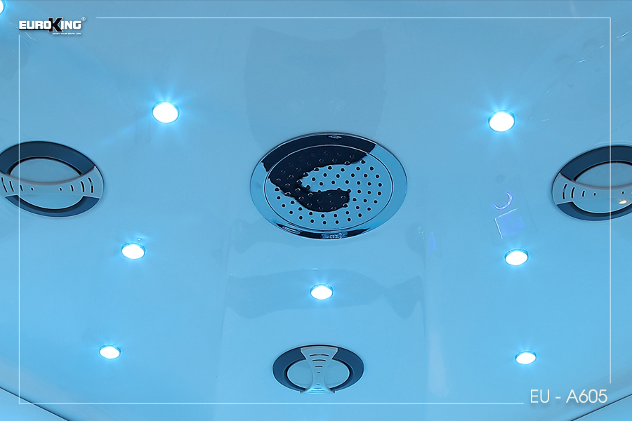 Đèn chiếu sáng được lắp đặt trên trần cung cấp ánh sáng cho phòng xông hơi. Bên cạnh đó, trần phòng xông hơi EU-A605 còn có quạt thông gió. Giúp lưu thông, điều hoà không khí để tránh gây ngột ngạt trong quá trình xông hơi. Sen trần phục vụ cho nhu cầu tắm rửa trước khi xông hơi.